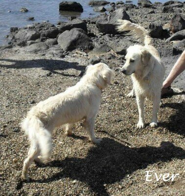 Si non, voici les photos d'Ever, qui se régale, qui se baigne, qui est desormais tout à fait en relation avec moi, pour proméner sans laisse ( dans des endroits calmes ), me suivre partout. Nous sommes allés au restaurant, elle n'aime pas beaucoup, mais elle suit. Les routes avec beaucoup de voitures, ne sont pas terribles, mais elle commence à s'y habituer aussi. Dans le cadre familiale ça va beaucoup mieux, elle ne fuit plus les "autres" membres de la famille, je peux la faire courir au jardin, elle ne s'échappe plus, bref, c'est un amour. Vous n'avez pas du tout perdu du temps. Il a fallu du temps, entre temps, elle a eu ses chaleurs, et le temps passant, elle s'attache à tout le monde, sa maison etc. La déritualisation a été bénéfique, quand ma fille est là, elle dort avec elle, et quand elle est absente, on la fait dormir dans le salon. Elle mange, quand je lui présente sa gamelle, d'ailleurs elle mange bien avec bon appétit !