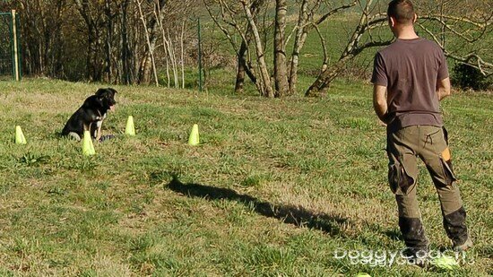 Envoyer le chien dans son carré de plus en plus loin. Là, ceux qui ont suivis un forfait éducation sont forcément avantagés ! :-)